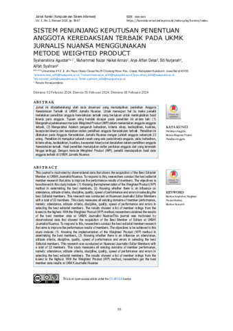 Syalvanabina, Agustiar and Muhammad, Nazar Haikal Annas and Arya, Alfian Desa and Siti, Nurjanah and Alifah, Syahrani (2024) Sistem penunjang keputusan penentuan anggota keredaksian terbaik pada UKMK Jurnalis Nuansa menggunakan metode Weighted Product. Jurnal Komputer dan Sistem Informasi (KOMISI), 1 (2): 3. pp. 59-67. ISSN 3062-6668