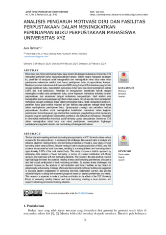 Aura, Rahman (2024) Analisis pengaruh motivasi diri dan fasilitas perpustakaan dalam meningkatkan peminjaman buku perpustakaan mahasiswa Universitas XYZ. Jurnal Komputer dan Sistem Informasi (KOMISI), 1 (2): 5. pp. 76-82. ISSN 3062-6668