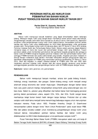Winastri, Pertiwi Diah and Susanto, Susanto and Wahyono, Hendro (2018) PERIZINAN INSTALASI NUKLIR DAN PEMANFAATAN BAHAN NUKLIR PUSAT TEKNOLOGI BAHAN BAKAR NUKLIR TAHUN 2017. Prosiding Seminar Hasil-hasil Penelitian EBN Tahun 2017, - (-). pp. 469-477. ISSN 0854-5561