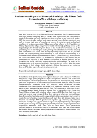 Prsetyawan, Prsetyawan and Yuswanti, Yuswanti and Retno, Palupi (2024) Pembentukan organisasi kelompok budidaya lele di Desa Codo Kecamatan Wajak Kabupaten Malang. Dedikasi Cendekia: Warta Pengabdian Pendidikan, 1 (1): 3. pp. 13-18. ISSN 3062-6803
