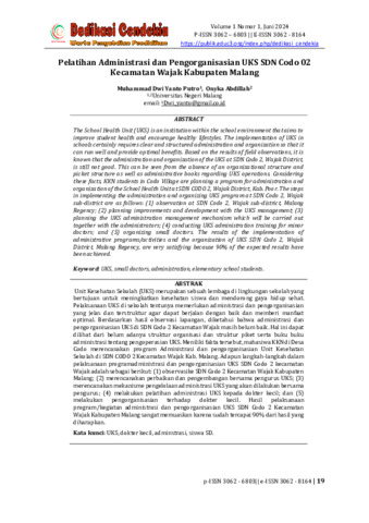 Muhammad, Dwi Yanto Putro and Onyka, Abdillah (2024) Pelatihan administrasi dan peengorganisasian UKS SDN Codo 02 Kecamatan Wajak Kabupaten Malang. Dedikasi Cendekia: Warta Pengabdian Pendidikan, 1 (1): 4. pp. 19-23. ISSN 3062-6803