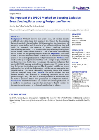 Marni, br Karo and Ezra, Tamba and Farida, Simajuntak (2024) The impact of the SPEOS method on boosting exclusive breastfeeding rates among postpartum women. Svāsthya: Trends in General Medicine and Public Health, 1 (1): 2. pp. 1-7. ISSN 3063-0649