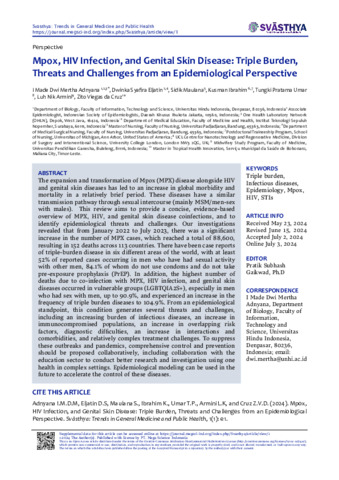 I Made, Dwi Mertha Adnyana and Dwinka, Syafira Eljatin and Sidik, Maulana and Kusman, Ibrahim and Tungki, Pratama Umar and Luh, Nik Armani and Zito, Viegas da Cruz (2024) Mpox, HIV infection, and genital skin disease: triple burden, threats and challenges from an epidemiological perspective. Svāsthya: Trends in General Medicine and Public Health., 1 (1): 5. pp. 1-14. ISSN 3063-0649