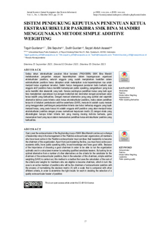 Teguh, Gustiana and Diki, Saputra and Dudih, Gustian and Sayyid, Abduh Assaad (2023) Sistem pendukung keputusan penentuan ketua ekstrakurikuler paskibra SMK Bina Mandiri menggunakan metode Simple Additive Weighting. Jurnal Komputer dan Sistem Informasi (KOMISI), 1 (1): 4. pp. 27-34. ISSN 3062-6668