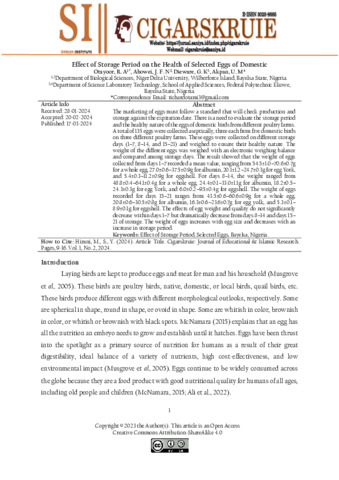 Otayoor, R. A and Abowei, J. F. N and Dieware, G. K and Akpan, U. M (2024) Effect of storage period on the health of selected eggs of domestic birds in Bayelsa State, Nigeria. Jurnal Pendidikan dan Studi Islam (Cigarskruie), 1 (2): 2. pp. 9-16. ISSN 3025-8685