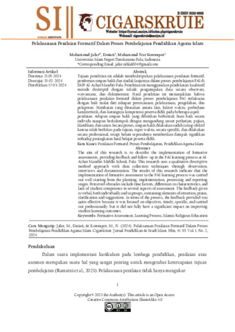 Mohammad, Jafar and Erniati, Erniati and Muhammad, Nur Korompot (2024) Pelaksanaan penilaian formatif dalam proses pembelajaran pendidikan agama islam. Jurnal Pendidikan dan Studi Islam (Cigarskruie), 1 (2): 4. pp. 41-55. ISSN 3025-8685