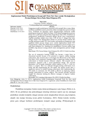 Nani, Arini (2024) Implementasi model pembelajaran kooperatif Think Pair Share untuk meningkatkan prestasi belajar siswa pada mata pelajaran IPA. Jurnal Pendidikan dan Studi Islam (Cigarskruie), 1 (2): 6. pp. 56-75. ISSN 3025-8685