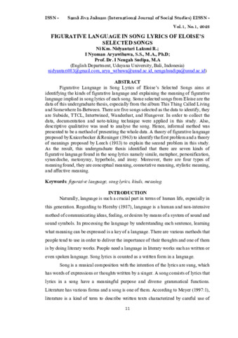 Ni, Km. Nidyantari Laksmi R. and I Nyoman Aryawibawa, S.S., M.A., Ph.D, Nyoman Aryawibawa and I, Nengah Sudipa (2023) Figurative language in song lyrics of Eloise’s selected songs. Samā Jiva Jnānam (International Journal of Social Studies), 1 (1): 2. pp. 11-18. ISSN 3062-9829