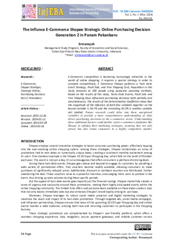 Ermansyah, Ermansyah (2024) The influnce e-commerce shopee strategic online purchasing decision Generation Z in Panam Pekanbaru. International Journal of Economics, Business and Accounting (InJEBA ), 2 (1): 5. pp. 94-101. ISSN 3032-3754