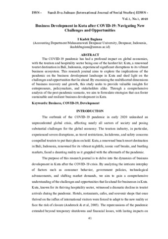 I, Kadek Bagiana (2023) Business development in Kuta after covid-19: Navigating new challenges and opportunities. Samā Jiva Jnānam (International Journal of Social Studies), 1 (1): 6. pp. 41-47. ISSN 3062-9829