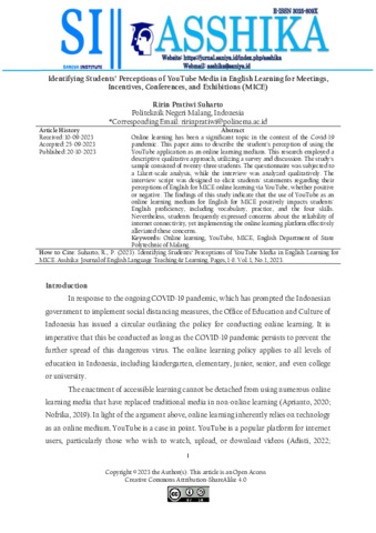 Ririn, Pratiwi Suharto (2023) Identifying students’ perceptions of youtube media in english learning for meetings, incentives, conferences, and exhibitions (MICE). Jurnal Pengajaran dan Pembelajaran Bahasa Inggris (Asshika), 1 (1): 1. pp. 1-8. ISSN 3025-809X