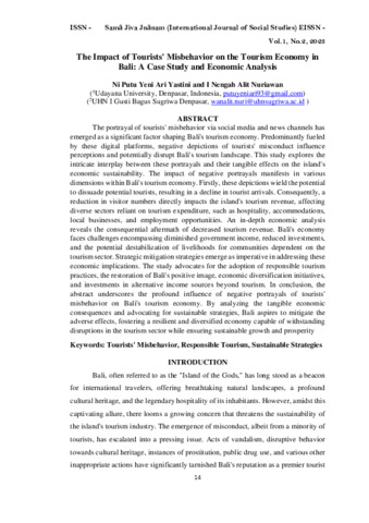 Ni, Putu Yeni Ari Yastini and I, Nengah Alit Nuriawan (2023) The impact of tourists' misbehavior on the tourism economy in Bali: a case study and economic analysis. Samā Jiva Jnānam (International Journal of Social Studies), 1 (2): 2. pp. 14-27. ISSN 3062-9829