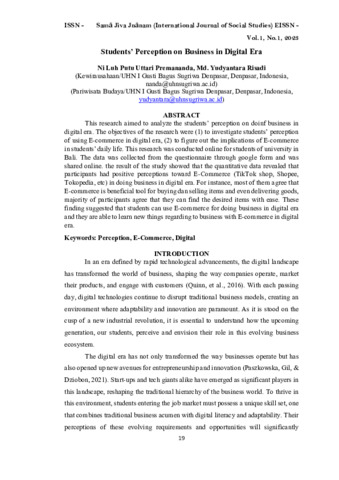 Ni, Luh Putu Uttari Premananda and Md., Yudyantara Risadi (2024) Students’ perception on business in digital era. Samā Jiva Jnānam (International Journal of Social Studies), 1 (2): 6. pp. 73-81. ISSN 3062-9829