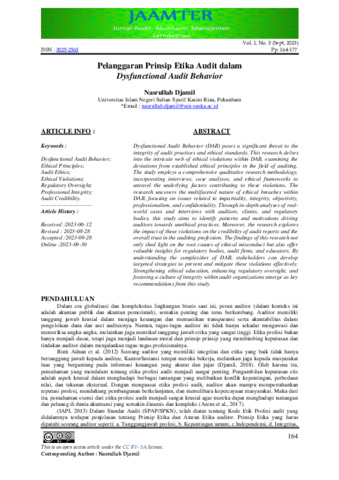 Nasrullah, Djamil (2023) Pelanggaran prinsip etika audit dalam dysfunctional audit behavior. Jurnal Audit, Akuntansi, Manajemen Terintegrasi (JAAMTER), 1 (3): 3. pp. 164-177. ISSN 3025-2563