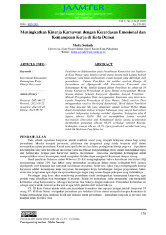 Mulia, Sosiady (2023) Meningkatkan kinerja karyawan dengan kecerdasan emosional dan kemampuan kerja di Kota Dumai. Jurnal Audit, Akuntansi, Manajemen Terintegrasi (JAAMTER), 1 (3): 4. pp. 178-185. ISSN 3025-2563