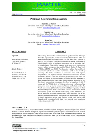Hazwin, Al Farid and Nurnasrina, Nurnasrina and Syahfawi, Syahfawi (2023) Penilaian kesehatan Bank Syariah. Jurnal Audit, Akuntansi, Manajemen Terintegrasi (JAAMTER), 1 (4): 7. pp. 254-263. ISSN 3025-2563