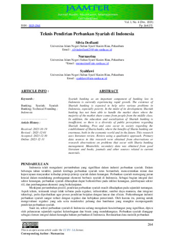 Silvia, Desfianti and Nurnasrina, Nurnasrina and Syahfawi, Syahfawi (2023) Teknis pendirian perbankan Syariah di Indonesia. Jurnal Audit, Akuntansi, Manajemen Terintegrasi (JAAMTER), 4 (1): 8. pp. 264-272. ISSN 3025-2563