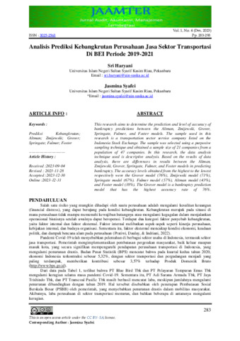 Sri, Haryani and Jasmina, Syafei (2023) Analisis prediksi kebangkrutan perusahaan jasa sektor transportasi di BEI periode 2019-2021. Jurnal Audit, Akuntansi, Manajemen Terintegrasi (JAAMTER), 1 (4): 10. pp. 283-293. ISSN 3025-2563