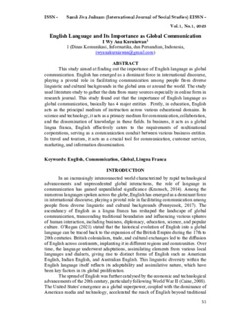 I, Wy Ana Kurniawan (2024) English language and its importance as global communication. Samā Jiva Jnānam (International Journal of Social Studies), 2 (1): 7. pp. 51-57. ISSN 3062-9829