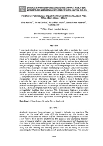 Lina, Marlina and Iin, Ira Kartika and Rizky, Fitri Andini and Samsiah, Nur Hasanah and Sulistiawati, Sulistiawati (2024) Penerapan psikoedukasi dalam penanganan stress akademik pada siswa kelas XI MAN I Bekasi. Jurnal Kreativitas Pengabdian kepada Masyarakat, 7 (9): 18. pp. 3959-3974. ISSN 2615-0921