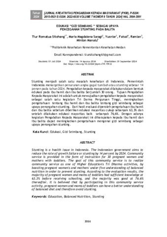 Tiur, Romatua Sitohang and Maria, Magdalena Saragi and Yusniar, Yusniar and Faisal, Faisal and Ramlan, Ramlan and Minton, Manalu (2024) Edukasi “gizi seimbang“ sebagai upaya pencegahan stunting pada balita. Jurnal Kreativitas Pengabdian kepada Masyarakat, 7 (9): 20. pp. 3984-3991. ISSN 2615-0921
