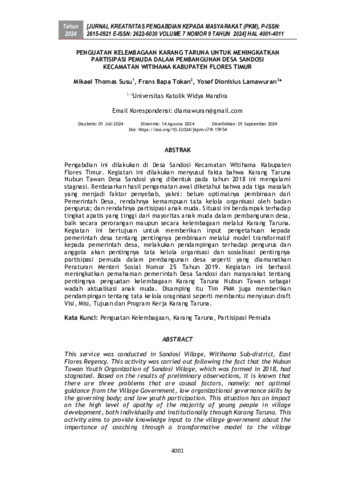 Mikael, Thomas Susu and Frans, Bapa Tokan and Yosef, Dionisius Lamawuran (2024) Penguatan kelembagaan Karang Taruna untuk meningkatkan partisipasi pemuda dalam pembangunan Desa Sandosi Kecamatan Witihama Kabupaten Flores Timur. Jurnal Kreativitas Pengabdian kepada Masyarakat, 7 (9): 22. pp. 4001-4011. ISSN 2615-0921