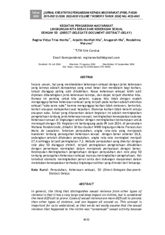 Regina, Vidya Trias Novita and Anjelin, Nonifati Hia and Anugerah, Hia and Rosdelima, Waruwu (2024) Kegiatan pengabdian masyarakat lingkungan kita bebas dari kekerasan sexual dengan 5D (Direct-Delegate-Document-Distract-Delay). Jurnal Kreativitas Pengabdian kepada Masyarakat, 7 (9): 25. pp. 4032-4043. ISSN 2615-0921