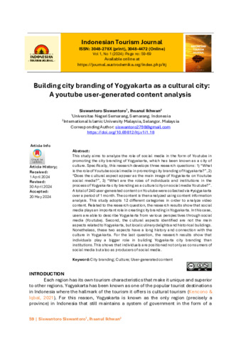 Siswantoro, Siswantoro and Ihsanul, Ikhwan (2024) Building city branding of Yogyakarta as a cultural city: A youtube user-generated content analysis. Indonesian Tourism Journal, 1 (1): 5. pp. 59-69. ISSN 3048-278X