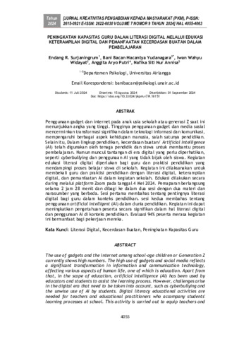 Endang, R. Surjaningrum and Bani Bacan, Hacantya Yudanagara and Iwan, Wahyu Widayat and Anggita, Aryo Putri and Nafika, Siti Nur Annisa (2024) Peningkatan kapasitas guru dalam literasi digital melalui edukasi keterampilan digital dan pemanfaatan kecerdasan buatan dalam pembelajaran. Jurnal Kreativitas Pengabdian kepada Masyarakat, 7 (9): 27. pp. 4055-4063. ISSN 2615-0921