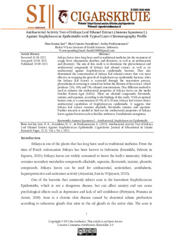 Dian, Kurnia Sari and Hari, Untarto Swandono and Arshy, Prodyanatasari (2023) Antibacterial activity test of srikaya leaf ethanol extract (Annona Squamosa L) against Staphylococcus Epidermidis with Typical Layer Chromatography Profile. Jurnal Pendidikan dan Studi Islam (Cigarskruie), 1 (1): 4. pp. 25-32. ISSN 3025-8685