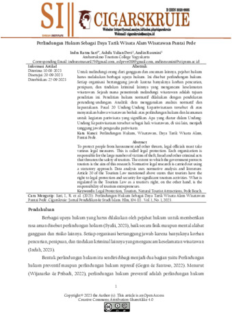 Indra, Ratna Sari and Ashifa, Yulian Devi and Andin, Rusmini (2023) Perlindungan hukum sebagai daya tarik wisata alam wisatawan Pantai Pede. Jurnal Pendidikan dan Studi Islam (Cigarskruie), 1 (1): 12. pp. 104-111. ISSN 3025-8685