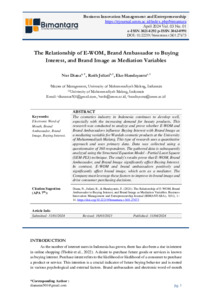 Nur, Diana and Ratih, Juliati and Eko, Handayanto (2024) The relationship of e-wom, brand ambassador to buying interest, and brand image as mediation variables. Business Innovation Management and Entrepreneurship Journal (BIMANTARA), 3 (1): 1. pp. 1-14. ISSN 3063-0991