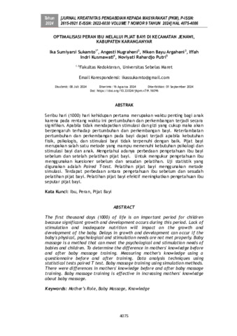 Ika, Sumiyarsi Sukamto and Angesti, Nugraheni and Niken, Bayu Argaheni and Iffah, Indri Kusmawati and Noviyati, Rahardjo Putri (2024) Optimalisasi peran ibu melalui pijat bayi di Kecamatan Jenawi, Kabupaten Karanganyar. Jurnal Kreativitas Pengabdian kepada Masyarakat, 7 (9): 29. pp. 4075-4086. ISSN 2615-0921