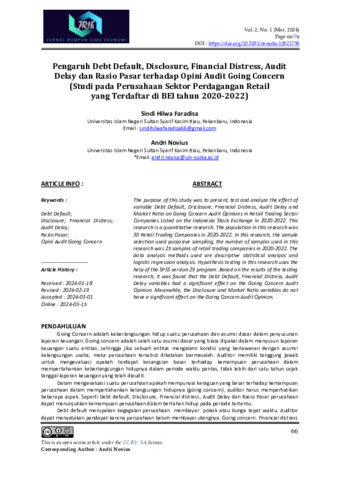 Sindi, Hilwa Faradisa and Andri, Novius (2024) Pengaruh debt default, disclosure, financial distress, audit delay dan rasio pasar terhadap opini audit going concern (studi pada perusahaan sektor perdagangan retail yang terdaftar di BEI tahun 2020-2022). Jurnal Rumpun Ilmu Ekonomi (JRIE), 2 (1): 2. pp. 66-76. ISSN 3046-8639