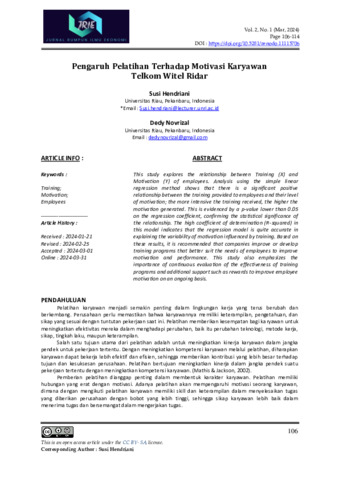 Susi, Hendriani and Dedy, Novrizal (2024) Pengaruh pelatihan terhadap motivasi karyawan Telkom Witel Ridar. Jurnal Rumpun Ilmu Ekonomi (JRIE), 2 (1): 6. pp. 106-114. ISSN 3046-8639