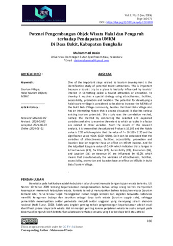 Muhammad, Dasio (2024) Potensi pengembangan objek wisata halal dan pengaruh terhadap pendapatan UMKM Di Desa Bukit Kabupaten Bengkalis. Jurnal Rumpun Ilmu Ekonomi (JRIE), 2 (2): 3. pp. 160-171. ISSN 3046-8639
