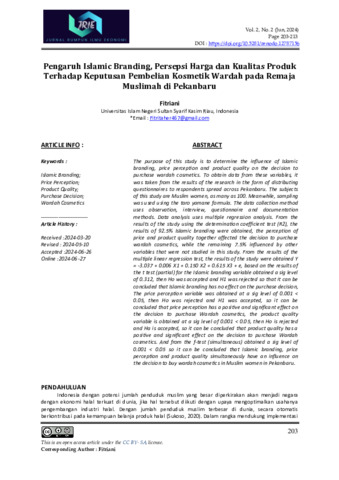 Fitriani, Fitriani (2024) Pengaruh islamic branding, persepsi harga dan kualitas produk terhadap keputusan pembelian kosmetik Wardah pada remaja muslimah di Pekanbaru. Jurnal Rumpun Ilmu Ekonomi (JRIE), 2 (2): 7. pp. 203-213. ISSN 3046-8639