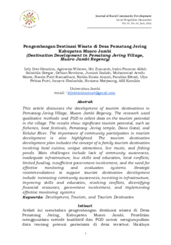 Artikel ini membahas pengembangan destinasi wisata di Desa Pematang Jering, Kabupaten Muaro Jambi. Penelitian menggunakan metode kualitatif dan FGD untuk mengumpulkan data tentang potensi pariwisata di desa tersebut. Hasilnya menunjukkan potensi pariwisata yang signifikan, seperti perikanan, festival perahu, candi Pematang Jering, Dano Gatal, dan Sungai Kelulut. Pentingnya partisipasi masyarakat dalam pengembangan pariwisata juga disoroti. Rencana pengembangan destinasi wisata mencakup konsep destinasi wisata keluarga dengan melibatkan kuliner khas, atraksi unik, live music, dan kolam pemancingan. Tantangan utama termasuk kurangnya kesadaran masyarakat, infrastruktur yang kurang memadai, keterampilan dan pendidikan rendah, konflik lokal, keterbatasan dana, keterlibatan pemerintah yang kurang, serta kebutuhan akan sistem pengawasan dan evaluasi yang baik. Saran strategis untuk mendukung pengembangan destinasi wisata termasuk peningkatan kesadaran masyarakat, investasi infrastruktur, peningkatan keterampilan dan pendidikan, penyelesaian konflik, diversifikasi sumber daya keuangan, keterlibatan pemerintah, dan implementasi sistem pengawasan yang efektif.