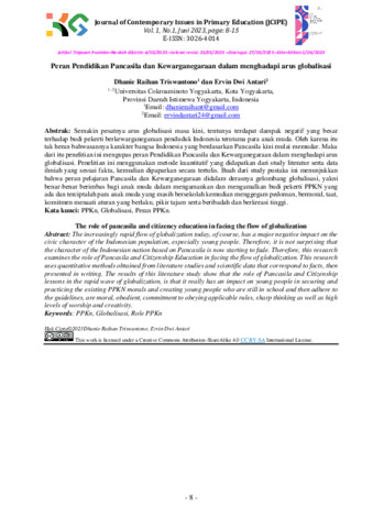 Dhanie, Raihan Triswantono and Ervin, Dwi Antari (2023) Peran Pendidikan Pancasila dan Kewarganegaraan dalam menghadapi arus globalisasi. Journal of Contemporary Issues in Primary Education (JCIPE), 1 (1): 2. pp. 8-15. ISSN 3026-4014