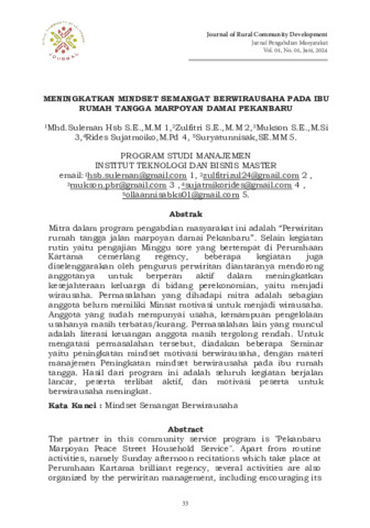 Suleman, Hasibuan and Zulfitri, Zulfitri and Mukson, Mukson and Rides, Sujatmoiko and Suryatunnisak, Suryatunnisak (2024) Meningkatkan mindset semangat berwirausaha pada ibu rumah tangga Marpoyan Damai Pekanbaru. Journal of Rural Community Development, 1 (1): 3. pp. 33-44. ISSN 3063-6183