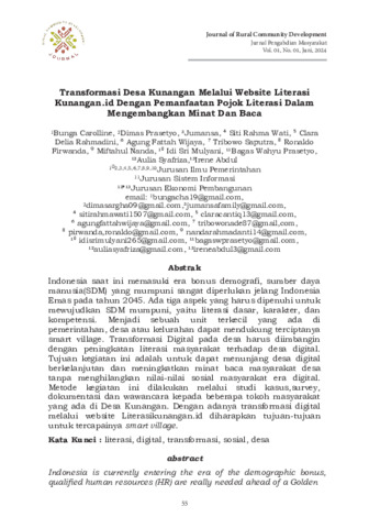 Bunga, Carolline and Dimas, Prasetyo and Jumansa, Jumansa and Siti, Rahma Wati and Clara, Delia Rahmadini and Agung, Fattah Wijaya and Tribowo, Saputra and Ronaldo, Firwanda and Miftahul, Nanda and Idi, Sri Mulyani and Bagas, Wahyu Prasetyo and Aulia, Syafriza and Irene, Abdul (2024) Transformasi Desa Kunangan melalui website literasi kunangan.id dengan pemanfaatan pojok literasi dalam mengembangkan minat dan baca. Journal of Rural Community Development, 1 (1): 5. pp. 55-74. ISSN 3063-6183