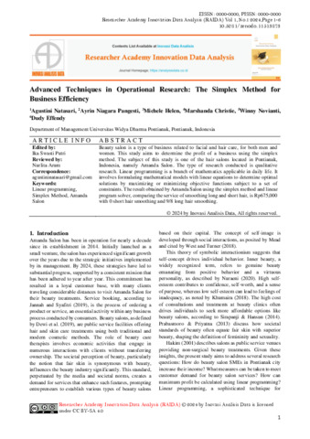Agustini, Natasari and Ayrin, Niagara Pangesti and Michele, Helen and Marshanda, Christie and Winny, Novianti and Dudy, Effendy (2024) The advanced techniques in operational research: the simplex method for business efficiency. Researcher Academy Innovation Data Analysis (RAIDA), 1 (1): 1. pp. 1-6. ISSN 3063-1092