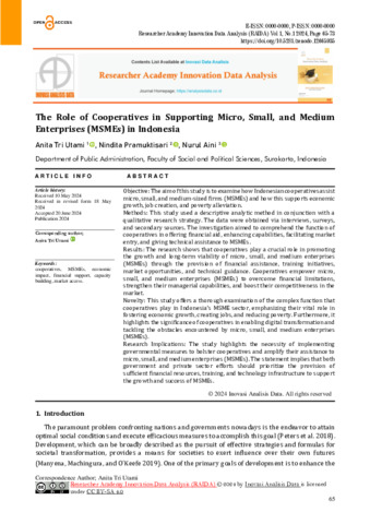 Anita, Tri Utami and Nindita, Pramuktisari and Nurul, Aini (2024) The role of cooperatives in supporting micro, small, and medium enterprises (MSMEs) in Indonesia. Researcher Academy Innovation Data Analysis (RAIDA), 1 (1): 9. pp. 65-73. ISSN 3063-1092