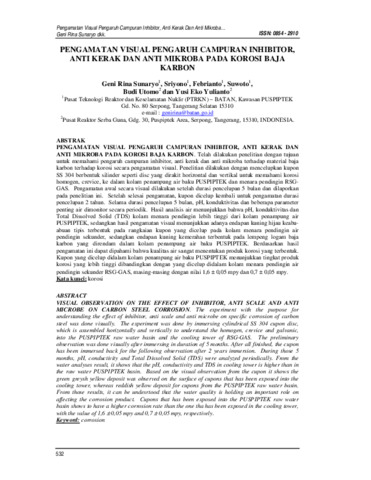 Geni Rina Sunaryo, GRS and Sriyono, Sriyono and Febrianto Bahar, FB and Suwoto, AW (2011) PENGAMATAN VISUAL PENGARUH CAMPURAN INHIBITOR, ANTI KERAK DAN ANTI MIKROBA PADA KOROSI BAJA KARBON. PENGAMATAN VISUAL PENGARUH CAMPURAN INHIBITOR, ANTI KERAK DAN ANTI MIKROBA PADA KOROSI BAJA KARBON. pp. 532-538. ISSN 0854-2910