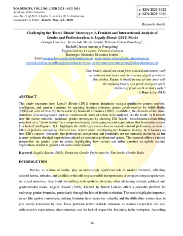 Georgia, Love Lee and Kezia, Jade Meizie Sabuin and Petronio, Pirdon Manullang and Rachell, Christie Anastasya Hutagalung (2024) Challenging the 'Dumb Blonde' stereotype: a feminist and intersectional analysis of gender and professionalism in Legally Blonde (2001) movie. Makarios Education Journal (BOANERGES), 2 (1): 9. pp. 95-106. ISSN 3025-3934