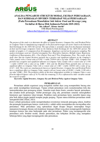 Ida, Adhani and Risma, Amelia (2024) Analisa pengaruh struktur modal, ukuran perusahaan, dan kebijakan dividen terhadap nilai perusahaan. Accounting Research and Business Journal (ARBUS), 2 (1): 2. pp. 18-28. ISSN 3025-8650