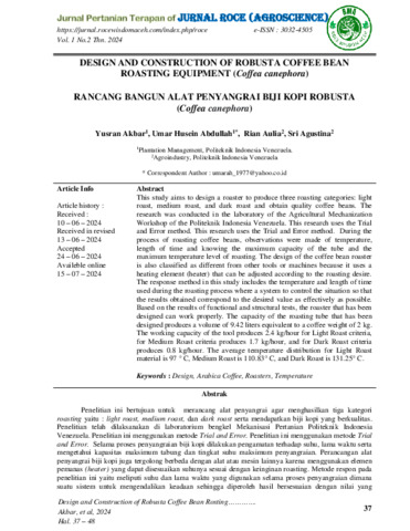 Yusran, Akbar and Umar, Husein Abdullah and Rian, Aulia and Sri, Agustina (2024) Design and construction of robusta coffee bean roasting equipment (coffea canephora). Jurnal Pertanian Terapan (ROCE), 1 (2): 1. pp. 37-48. ISSN 3032-4505