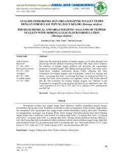 Improving the nutritional quality of tempeh nuggets can be done through food processing with the addition of moringa leaf flour. This study aims to improve the nutrition of tempeh nugget products and determine the organoleptic properties of tempeh nuggets after adding moringa leaf flour. This study used a single-factor complete randomized design (RAL) (Moringa leaf flour formulation for tempeh nuggets) and 5 treatments; control (0 g moringa leaf flour), 1 g moringa leaf flour, 2 g moringa leaf flour, 3 g moringa leaf flour, 4 g moringa leaf flour. Each treatment was repeated 3 times. The results showed that the best treatment for making tempeh nuggets was obtained in the formulation of tempeh 50 g and moringa leaf flour 4 g on nutritional value. The value of protein is 9.37%, fat 12.73%, ash 2.17%, calcium 2.91%, and elasticity test 889.7g/f.