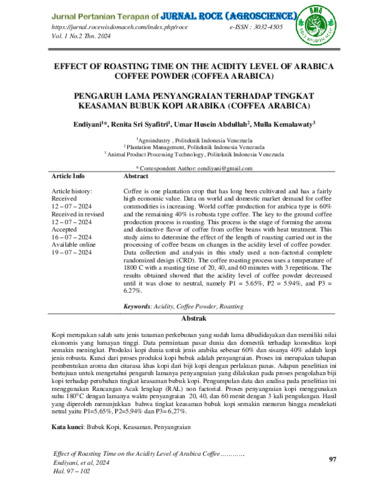 Endiyani, Endiyani and Renita, Sri Syafitri and Umar, Husein Abdullah and Mulla, Kemalawaty (2024) Effect of roasting time on the acidity level of arabica coffee powder (coffee arabica). Jurnal Pertanian Terapan (ROCE), 1 (2): 6. pp. 97-102. ISSN 3032-4505