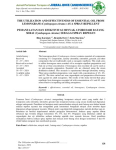 Rina, Kurniaty and Resmila, Dewi and Erda, Marniza (2024) The utilization and effectiveness of essential oil from lemongrass (Cymbopogon citratus) as a spray repellent. Jurnal Pertanian Terapan (ROCE), 1 (2): 10. pp. 128-137. ISSN 3032-4505